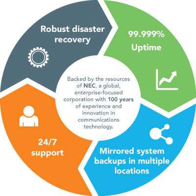 High reliability is mission critical for UNIVERGE BLUE. Software updates and maintenance are done in the cloud, keeping your operations up and running with no downtime.